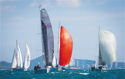 2023第十二届环海南岛国际大帆船赛在三亚举行,图为参赛船队在三亚港内比赛。 本报记者 宋国强 摄