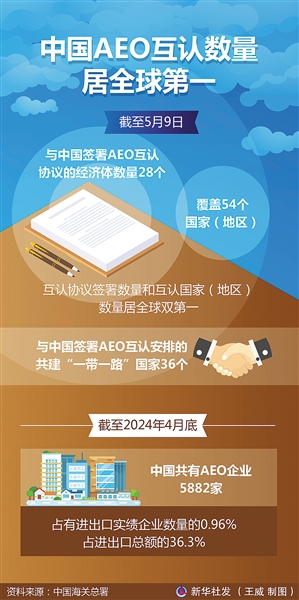 在扩大AEO国际互认合作方面,5月9日,海关总署分别与布隆迪共和国税务局、冰岛税务与海关署签署AEO互认安排。至此,中国已经与28个经济体签署AEO互认协议,覆盖54个国家(地区),互认协议签署数量和互认国家(地区)数量居全球“双第一”。