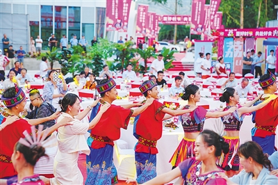 长桌上,芭蕉叶上的竹编簸箕盛满了陵水荔枝、白切文罗鹅、竹筒饭、椒盐海虾等多种陵水本土美味佳肴,嘉宾们不仅可以欣赏歌曲串烧和器乐演奏,还和黎族阿哥阿妹手牵手跳起舞蹈,近距离感受黎族文化的万种风情。