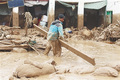 5月11日,在阿富汗巴格兰省巴格兰尼马尔卡济区,一名男子在受洪水影响的区域进行清理工作。