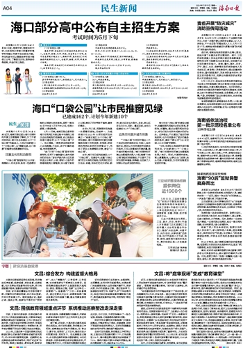 本报海口5月12日讯(记者习霁鸿)日前,海南中学、海南华侨中学、北京师范大学海口附属学校等学校相继公布高中自主招生方案。考生和家长可以搜索各学校官方微信公众号,了解招生计划、报考条件等信息,并进行网上报名。1