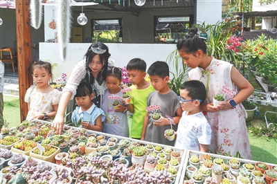 图为多肉园的员工在给孩子们讲解栽培要点,让孩子们在动手的过程中学习栽培多肉植物。