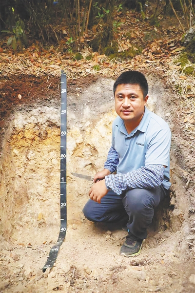 张冬明(中)在定安指导剖面采样人员采集剖面整段标本。