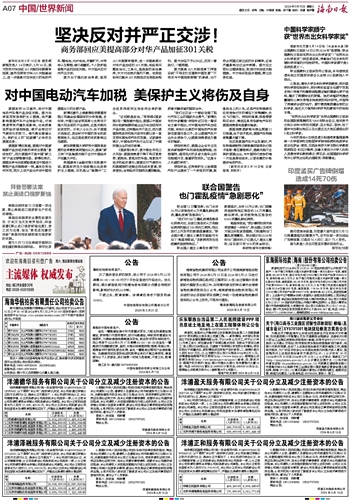 美方提高301关税违背了拜登总统“不寻求打压遏制中国发展”“不寻求与中国脱钩断链”的承诺,也不符合两国元首达成的共识精神,这将严重影响双边合作氛围。美方应立即纠正错误做法,取消对华加征关税措施。中方将采取坚决措施,捍卫自身权益。