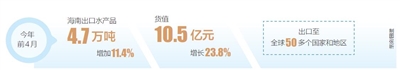 本报海口5月17日讯(记者曹马志 通讯员林华婷 实习生谢城安)今年前4月,海南出口水产品4.7万吨,增加11.4%;货值10.5亿元,增长23.8%,出口至全球50多个国家和地区。这是海南日报记者5月17日从海口海关获悉的。海南有着得天独厚的气候条件、优质的水源和丰富的种质资源,水产苗种培育周期短、效益较高,水产品已成为全省重要的出口产品。“为助推水产品‘畅游海外’,海关采取了货物‘抵港直装’、水产品‘边检边放’等便利措施,实施‘源头把控—合格评定—过程监控’监管模式,有力提升水产品通关速率。”海口海关所属海口港海关综合业务科科长甘佳勇说,海关还选派业务骨干开展出口业务专题培训,“手把手”指导企业用好用足原产地签证规则,推广实施原产地证书“自助打印”,确保出口水产品顺利清关并享受进口国关税优惠。