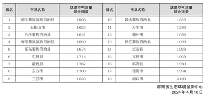 环境空气质量排名靠前的市县分别是琼中黎族苗族自治县、五指山市和白沙黎族自治县,排名靠后的市县分别是海口市、琼海市和临高县。2024年3月全省18个市县环境空气质量排名如右: