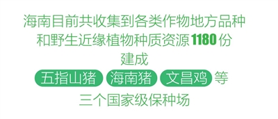 此外,海南目前共收集到各类作物地方品种和野生近缘植物种质资源1180份,建成五指山猪、海南猪、文昌鸡等三个国家级保种场,持续推进濒危物种拯救工程,建设珍稀濒危物种和重要遗传资源繁育基地,推动坡鹿、坡垒、野生稻等珍稀濒危野生动植物和极小种群物种的迁地保护和种群恢复。