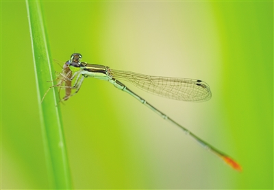 近日,在海口五源河国家湿地公园,褐斑异痣蟌在进食。