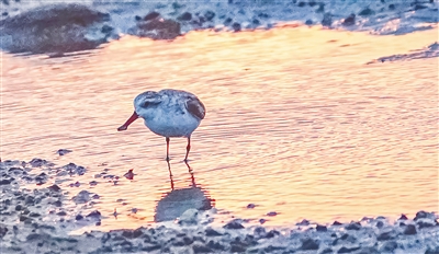 近日,在儋州湾的滩涂上,一只勺嘴鹬在夕阳下觅食。 本报记者 陈元才 摄