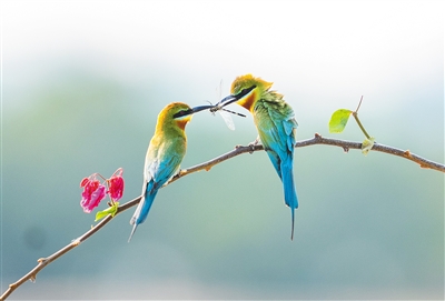 在澄迈花场湾,雄性栗喉蜂虎(右)将食物喂给雌性栗喉蜂虎。栗喉蜂虎是国家二级保护动物,被誉为“中国最美小鸟”。