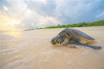在三沙北岛,一只海龟爬向大海。 本报记者 袁琛 摄