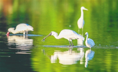 在儋州市儋州湾,黑脸琵鹭在水中觅食嬉戏。 本报记者 陈元才 摄
