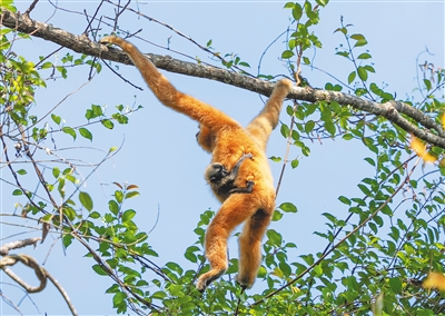 在海南热带雨林国家公园霸王岭片区,海南长臂猿带着幼崽觅食。