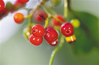 海南热带雨林国家公园五指山片区,学名为“九节”植物的红色果实。
