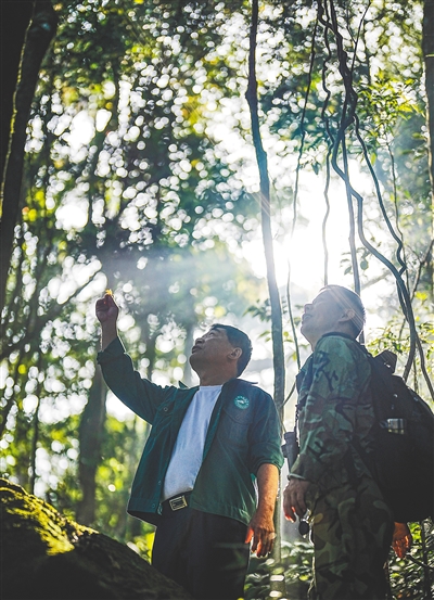 海南热带雨林国家公园霸王岭片区,护林员巡山观察动植物。 陈泽峰 摄