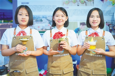 中职学生在2024年海南省职业教育活动周启动仪式上展示其调配的茶饮。本报记者 张茂 摄
