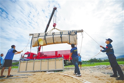 消防人员熟练驾驶吊机车来到医疗池旁,车上载有护送“海棠”回家的“摇篮”——专业水槽。演练开始,随着吊机起降,水槽被顺利放置至指定地点。志愿者们拿着事先准备好的泡沫板和防水布,有序放置在水槽四周。