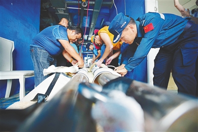 工作人员将担架捆绑稳固。本组图片均由本报记者 王程龙 摄
