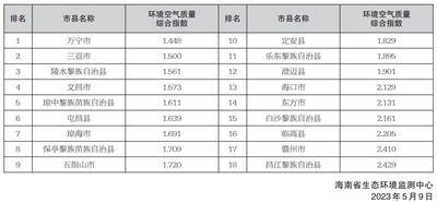 按照《环境空气质量标准》(GB3095-2012)及修改单、《环境空气质量评价技术规范(试行)》(HJ663-2013)和《城市环境空气质量排名技术规定》(环办监测〔2018〕19号)评价,2024年4月,全省环境空气质量优良天数比例为100%,其中优级天数比例为88.7%,良级天数比例为11.3%,无轻度及以上污染天。环境空气质量排名靠前的市县分别是万宁市、三亚市和陵水黎族自治县,排名靠后的市县分别是昌江黎族自治县、儋州市和临高县。2024年4月全省18个市县环境空气质量排名如右: