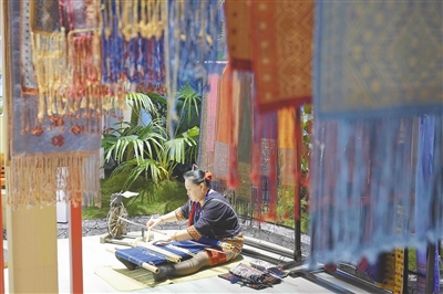 5月23日,在第二十届深圳文博会海南展馆里,海南省非物质文化遗产项目黎族“双面绣”技艺代表性传承人符秀英现场展示织锦技艺。