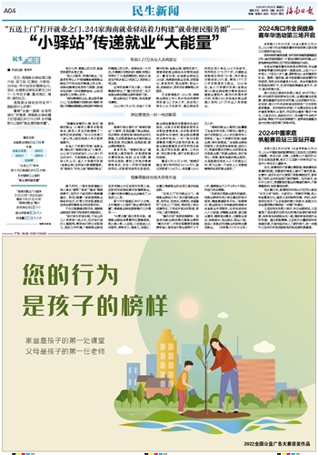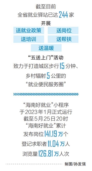 “五送上门”打开就业之门。海南就业驿站工作人员开展送就业政策、送岗位、送培训、送帮扶、送温暖的“五送上门”活动,既向用人单位征集岗位,又寻访并培训求职者,努力将二者对接起来。