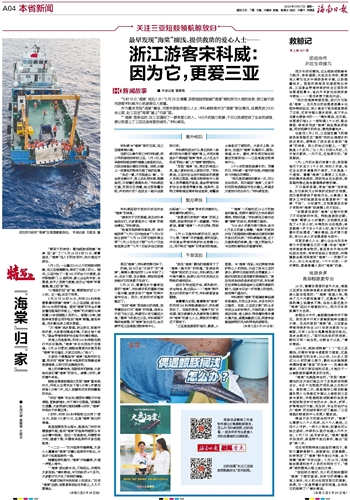 也是在1月3日,三亚固定翼飞机驾驶员李思聪还在“埋怨”相约出海潜水的朋友爽约,便得知了朋友前去救助“海棠”的消息。热心的他立马跟上,一“跟”就是3个多月。“从1月3日到4月初,几乎每天都来,一天不见,还怪想它的。”李思聪说。