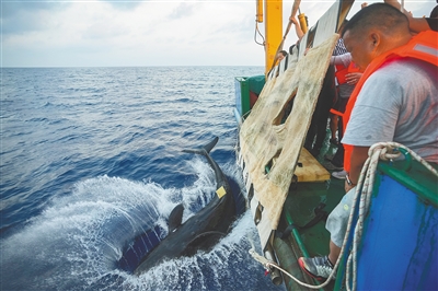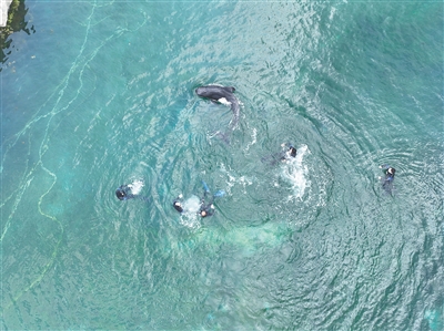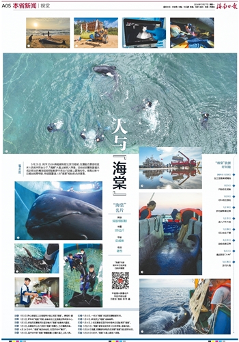 5月26日,利洋358科考船顺利抵达放归海域,在随船志愿者和技术人员的共同协力下,“海棠”从船上被放入深海。这也标志着我国首次成功救治的搁浅短肢领航鲸野外放生行动画上圆满句号。海南日报今日推出视觉专版,用组图重温人与“海棠”相处的点点滴滴。