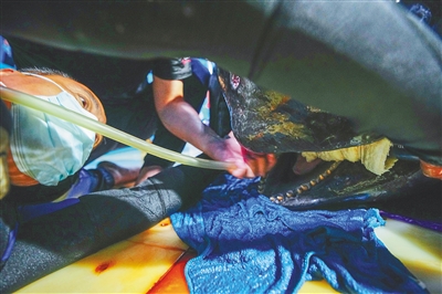 图4 1月3日,志愿者齐心协力掰开“海棠”的嘴巴,为它灌喂流食。