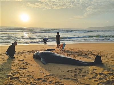 图1 1月3日,热心游客在三亚海棠湾沙滩上发现“海棠”。龚旭姣 摄