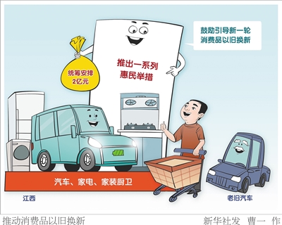 新华社南昌5月26日电 (记者陈春园)记者从江西省商务厅获悉,围绕汽车、家电、家装厨卫,江西省统筹安排2亿元推出一系列惠民举措,鼓励引导新一轮消费品以旧换新。江西省商务厅副厅长黄小燕表示,自2024年4月24日至2024年12月31日期间,江西对个人消费者报废国三及以下排放标准燃油乘用车或者2018年4月30日前(含当日)注册登记的新能源乘用车,并购买纳入工信部《减免车辆购置税的新能源汽车车型目录》的新能源乘用车或者2.0升及以下排量燃油乘用车,给予一次性定额补贴。