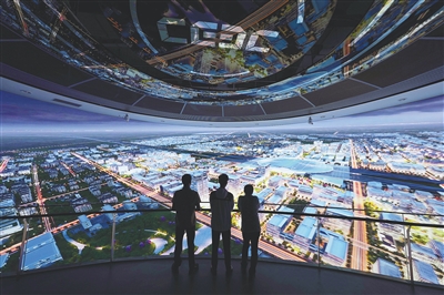 在雄安新区雄安站枢纽片区的中国能建“能建·新能源生态城”项目展示区内,游客通过球形大屏了解园区概况。据悉,该展示区设置智慧运维平台,实现物联网能源数据集成交互,后期将作为园区的一站式运营服务中心。 新华社记者 杨世尧 摄