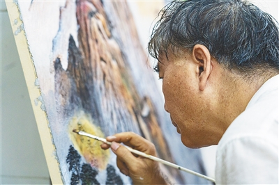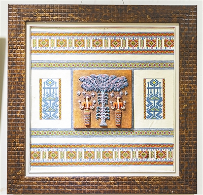 吴遇桢握着画笔,将颜料涂在案前的浮雕上。
