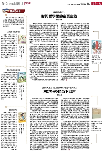 ■ 王晶阮忠《曲终人不见 江上数峰青:<老子>演讲录》(以下简称《演讲录》)是海南出版社国学经典文库《博约文丛》精品图书之一,也是“十四五”国家重点出版规划项目的阶段性成果。该书以丰富的史料、缜密的逻辑、平实的语言,引领读者走近老子,了解老子其人其事,增进对《老子》一书丰富思想及深厚文化内涵的认知。