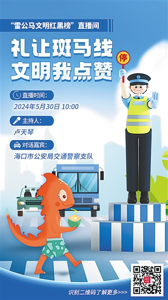 届时,海南省融媒体中心首席主持人卢天琴将对话海口市公安局交通警察支队交警,向网友介绍“礼让斑马线”的法律依据、评判标准、常识守则,并通过剖析群众身边的案例,以案释法说明不礼让斑马线的危害性。海南日报新媒体将全平台进行直播,敬请关注。