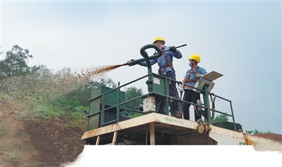 工人在喷播作业。本报记者 刘婧姝 摄