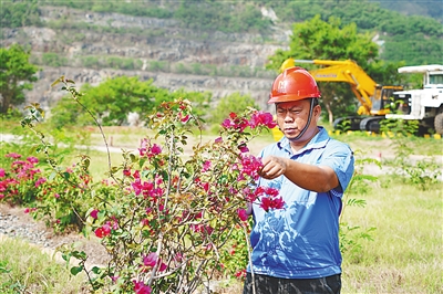 王澄盼查看花草长势。 本版图片除署名外,均由海南矿业供图