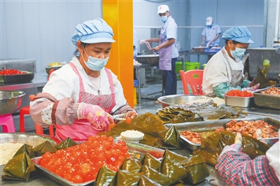 五月二十二日,后坡村永瑞味坊食品加工厂工作人员在裹粽子。本报记者 武威 摄