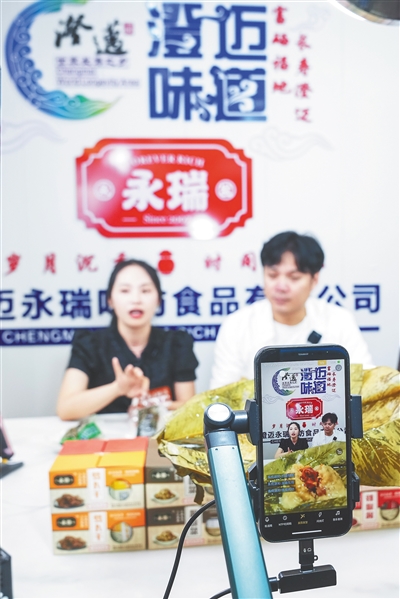 “这是产自澄迈县永发镇的辣椒酱、萝卜干,还有端午佳节必备的瑞溪粽子,欢迎大家选购……”5月28日,澄迈县永发镇后坡村永瑞味坊食品加工厂的二楼,一件件土特产,从后坡村“触网出圈”,奔向四面八方的网购者。