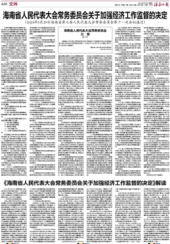 为深入贯彻习近平总书记关于坚持和完善人民代表大会制度的重要思想,贯彻落实党中央决策部署和省委工作要求,落实《海南省人大常委会2024年工作要点》安排,根据《全国人民代表大会常务委员会关于加强经济工作监督的决定》(以下简称全国人大常委会决定),省人大常委会制定《决定》是贯彻落实党中央决策部署和省委工作要求的重要举措。习近平总书记强调,要用好宪法赋予人大的监督权,实行正确监督、有效监督、依法监督。出台《决定》是学习贯彻习近平总书记视察海南重要讲话重要指示精神、落实省委“一本三基四粱八柱”战略框架的具体行动,有利于坚持我省人大经济工作监督正确方向,提高监督的针对性和有效性,提升人大经济工作监督规范化、制度化、法治化水平,有力推进经济工作重大决策落实落地;是贯彻落实全国人大常委会决定精神的重要途径和具体体现,有利于拓展省人大常委会经济工作监督的广度和深度,开创我省人大经济工作监督新局面;是加强和改进我省人大经济工作监督的现实需要,把我省各级人大开展经济工作监督的有效做法以及成熟经验总结提升,加以规范,有利于完善监督机制、明确监督程序、增强监督刚性、提高监督实效。