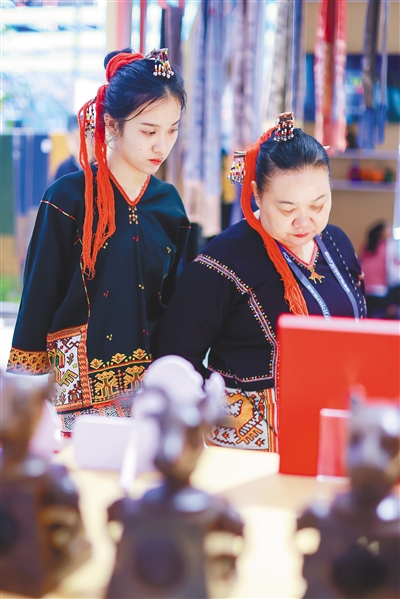 符秀英(右)在文博会上展示黎族传统纺染织绣技艺。