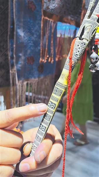 骨簪和骨梳上都系了一串铃铛,走起路来,铃声清脆。“在走山路时,铃铛就会跟着步伐发出声响,把周边的野兽驱赶走。”符秀英说,骨梳和骨簪不只是男女之间传递情愫的信物,也反映了人与自然、自然与社会之间更为复杂而有趣的关联。