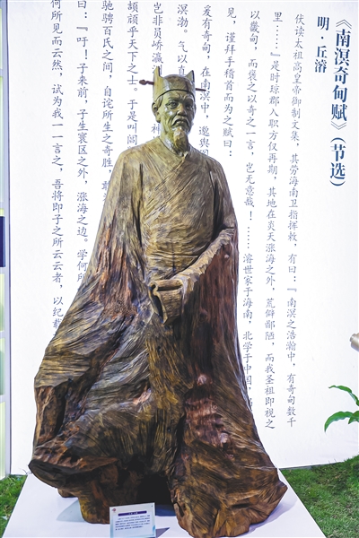 进入文博会海南展馆的入口处,矗立着一尊高约3米的丘濬木雕。木雕丘濬呈迈步前行姿态,手握书卷,衣袂飘飘,眉骨突出,炯炯有神的双目眺望远方。整体线条流畅洒脱,极富文人气韵。人们跟随他的诗意,走入琼州的锦绣画卷,开启“画中品海南”之旅。
