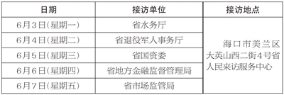 根据安排,6月3日至7日,省水务厅、省退役军人事务厅、省国资委、省地方金融监督管理局、省市场监管局相关负责人将分别在海口市美兰区大英山西二街4号“海南省人民来访服务中心”接访群众。