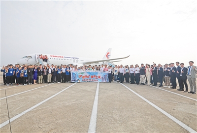 六月一日,参加欢迎仪式的人员在C919前合影留念。新华社发