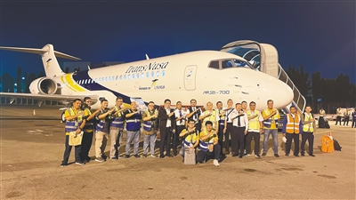 5月31日,在印度尼西亚雅加达苏加诺-哈达国际机场,工作人员在国产喷气式ARJ21飞机前合影。新华社发