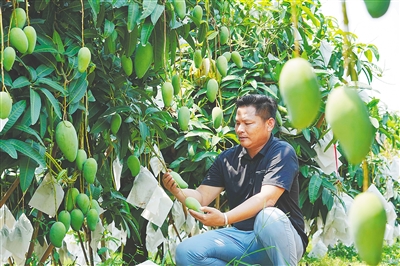 近日,位于陵水三才镇的十三义生态芒果农场,工作人员在查看芒果生长情况。