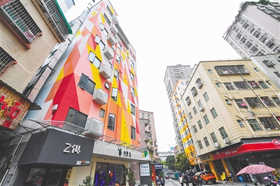 在深圳市龙华区元芬村拍摄的改造后的青年公寓外立面(左)。