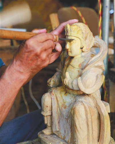 “每一根物料都是精心挑选的,在创作时要对物料有敬畏之心。这就要求创作者有发现自然之美的眼光,做到‘因材施艺’,让木雕作品有韵味。”黄黎祥介绍,近些年,木雕尤其是纯手工木雕,在建筑领域的运用正在减少,各地有少量新建的大型木结构建筑,但建设方一般也是批量购买工厂化生产的木构件。