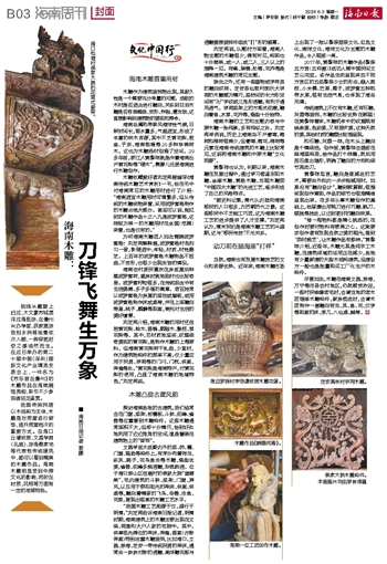 刘定邦介绍,海南木雕的用材还包括黄花梨、柚木、香楠、胭脂木、酸枝、草花梨等。其中,芯材质地坚实、纹理细密美观的黄花梨,是制作木雕的上等原料。但海南黄花梨树干虬曲、少直材,作为建筑物构件的频率不高,仅少量应用于民居、宗祠等的门闩、门枕、供案、神龛等处。“黄花梨是海南特产,对黄花梨的使用,凸显了海南木雕的地域特色。”刘定邦说。