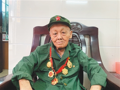 2022年5月,时年101岁的琼崖纵队老战士封尊锦接受媒体采访时的留影。